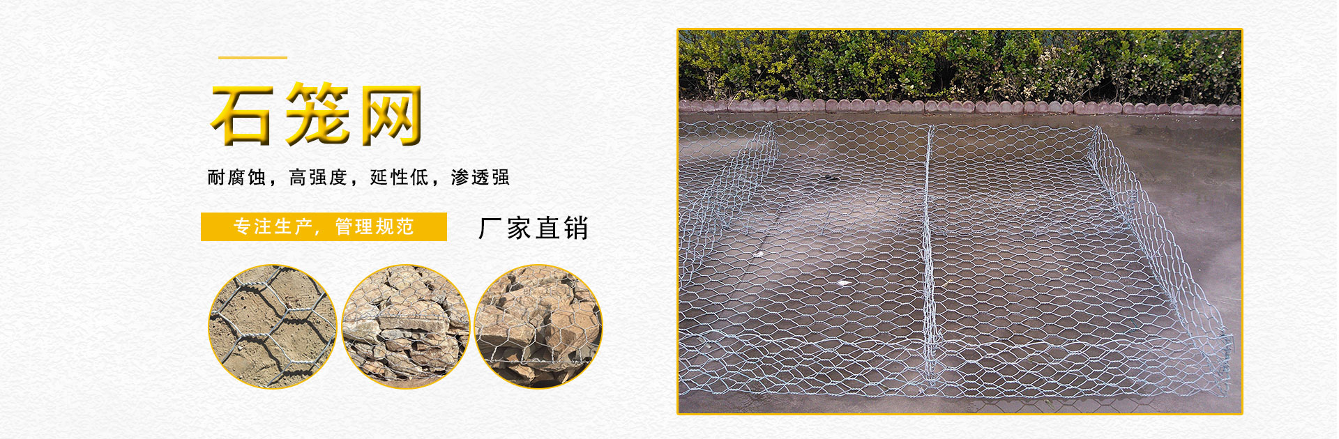 石籠網由高抗腐蝕、高強度、具有延展性的低碳鋼絲或者包覆PVC的以上鋼絲使用機械編織而成,使用該網制作而成的箱型結構就是石籠網箱。根據ASTM...